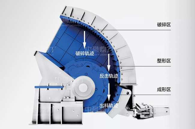 錘破制砂機內(nèi)部從上到下分別是物料的破碎區(qū)、整型區(qū)、成型區(qū),其中破碎區(qū)的襯板花紋設(shè)計為波浪下行式,對物料起到整形作用,中間的整型區(qū)反擊板采用了菱形花紋設(shè)計,物料的運動軌跡在錘頭下方,有利于減少物料在機腔內(nèi)重復破碎;