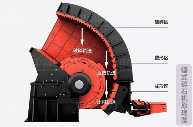 石頭通過(guò)給料機(jī)送入錘式碎石機(jī)破碎腔中,通過(guò)轉(zhuǎn)子帶動(dòng)錘頭高速旋轉(zhuǎn)對(duì)物料進(jìn)行破碎,物料被錘頭打擊破碎,然后被打擊到周?chē)r板上,再次產(chǎn)生破碎,如此反復(fù)顆粒小到可以通過(guò)下一階段,會(huì)自動(dòng)下落,直到可以從下料口排出。