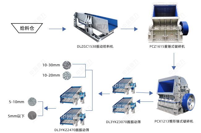 以上是時(shí)產(chǎn)600噸左右的石灰石錘式破碎工藝流程圖,圖中清晰看到,采用的是兩段破碎工藝,物料由振動(dòng)給料機(jī)送入PCZ1615重型錘式破碎機(jī)做粗碎,粗碎后的物料部進(jìn)入PC1213整形錘式破碎機(jī)進(jìn)行細(xì)碎和整形,經(jīng)過兩道篩分,篩分出4種不同規(guī)格的成品料。