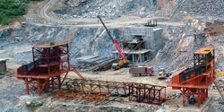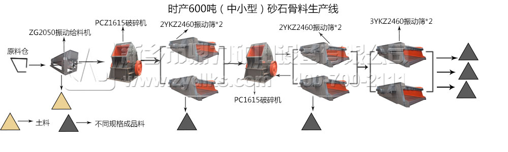 從工藝流程圖可以看到,時產(chǎn)600噸的中小型砂石骨料生產(chǎn)線不像大型、大型的生產(chǎn)線那種復(fù)雜曲折,這個工藝流程圖比較通俗易懂,一目了然。原料倉的物料進(jìn)過振動給料機(jī)進(jìn)入破碎機(jī)破碎腔內(nèi)進(jìn)行破碎的工作,破碎的物料經(jīng)過兩臺振動篩的同時篩分,一部分物料經(jīng)過篩分得到顆粒粒度合適的成品料,另一部分物料直接進(jìn)入二級破碎機(jī)破碎腔內(nèi)部進(jìn)行再次破碎,然后再經(jīng)過不同直徑規(guī)格的振動篩進(jìn)行篩分,再次獲得不同顆粒粒度的成品料。