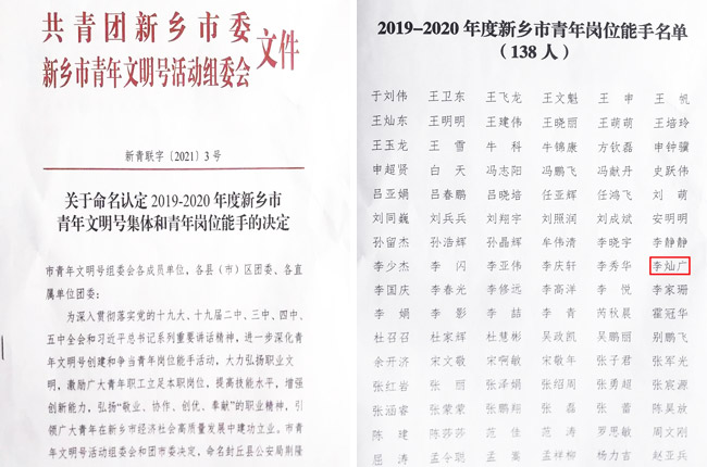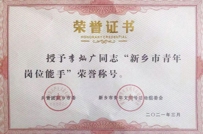 其中,中譽鼎力智能裝備有限公司技術(shù)中心副部長李燦廣被授予“新鄉(xiāng)市青年崗位能手”榮譽稱號!