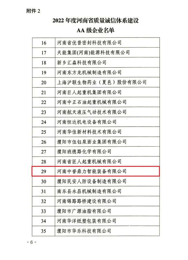 2022年度河南省質(zhì)量誠(chéng)信體系建設(shè)AA級(jí)企業(yè)名單