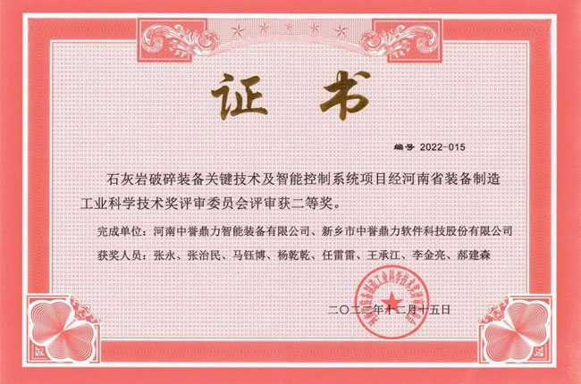 根據(jù)河南省裝備制造業(yè)協(xié)會(huì)、河南省高新技術(shù)企業(yè)協(xié)會(huì)《關(guān)于開展2022年度河南省裝備制造業(yè)科學(xué)技術(shù)獎(jiǎng)工作的通知》(豫裝制協(xié)【2022】04號(hào))文件要求,經(jīng)河南省裝備制造工業(yè)科學(xué)技術(shù)獎(jiǎng)評(píng)審委員會(huì)評(píng)審,河南中譽(yù)鼎力智能裝備有限公司與新鄉(xiāng)市中譽(yù)鼎力軟件科技股份有限公司共同研發(fā)的石灰?guī)r破碎裝備關(guān)鍵技術(shù)及智能控制系統(tǒng)項(xiàng)目獲河南省裝備制造業(yè)科學(xué)技術(shù)獎(jiǎng)二等獎(jiǎng)。