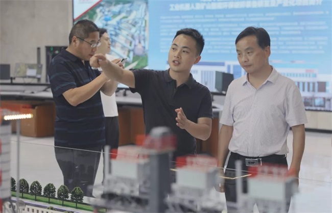 隨后,考察團(tuán)來(lái)到中譽(yù)鼎力智能裝備新廠區(qū),參觀了中譽(yù)鼎力五位一體循環(huán)建材產(chǎn)業(yè)園項(xiàng)目沙盤(pán),并在接待室進(jìn)行座談。