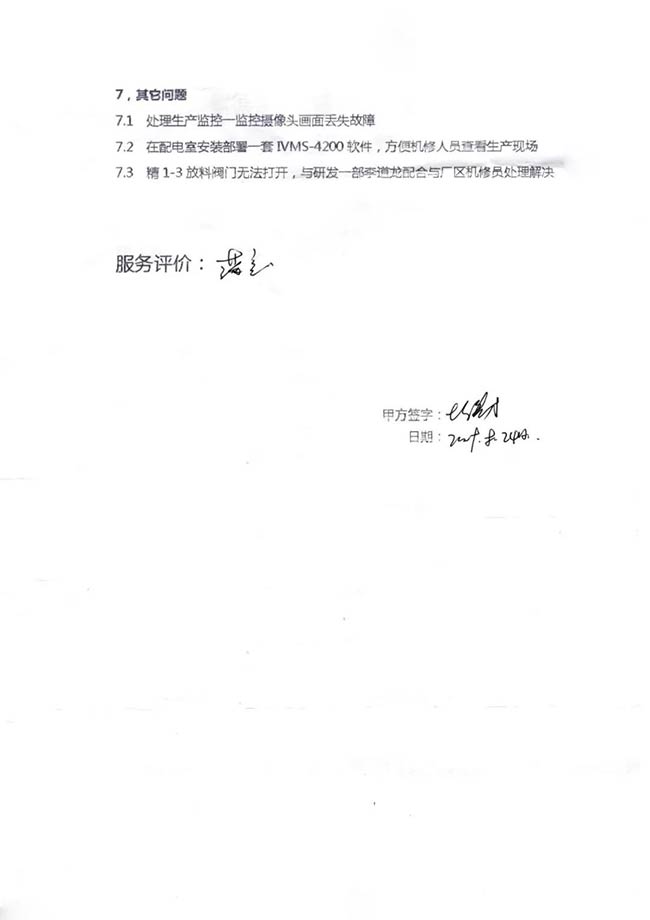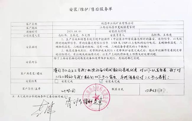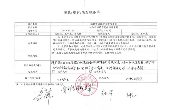 與客戶打交道的過(guò)程,不僅有電氣成套設(shè)備、低壓配電柜、礦山骨料生產(chǎn)線的管理軟件的安裝調(diào)試,還有監(jiān)控設(shè)備工程、電氣工程的施工等等。咨詢,設(shè)計(jì),施工,調(diào)試,維護(hù),培訓(xùn)……如何做到每一個(gè)環(huán)節(jié)都精益求精,達(dá)到客戶要求?完善的質(zhì)量管控和服務(wù)體系不可少。而“項(xiàng)目服務(wù)單”就是其中一項(xiàng)重要措施,記載并參與了服務(wù)的過(guò)程。