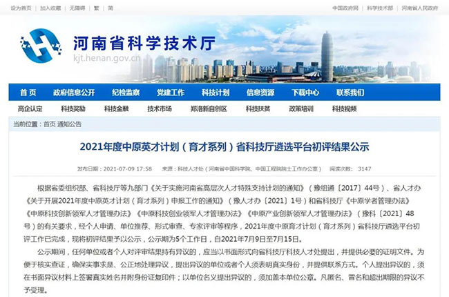 根據(jù)河南省委組織部、省科技廳等九部門《關(guān)于實(shí)施河南省高層次人才支持計(jì)劃的通知》(豫組通〔2017〕44號(hào))、省人才辦《關(guān)于開(kāi)展2021年度中原英才計(jì)劃(育才系列)申報(bào)工作的通知》(豫人才辦〔2021〕1號(hào))和省科技廳《中原學(xué)者管理辦法》《中原科技創(chuàng)新軍人才管理辦法》《中原科技創(chuàng)業(yè)軍人才管理辦法》《中原產(chǎn)業(yè)創(chuàng)新軍人才管理辦法》(豫科〔2021〕48號(hào))的有關(guān)要求,經(jīng)個(gè)人申請(qǐng)、單位、形式審查、評(píng)審等程序,7月9日,2021年度中原育才計(jì)劃(育才系列)省科技廳遴選平臺(tái)初評(píng)工作完成,并將結(jié)果予以公示。