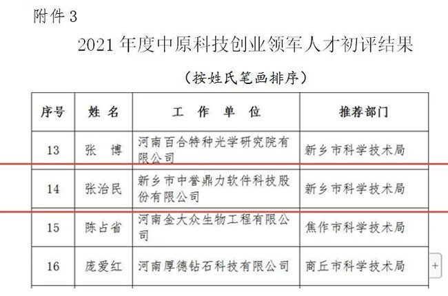 經(jīng)新鄉(xiāng)市科學(xué)技術(shù)局,新鄉(xiāng)市中譽(yù)鼎力軟件科技股份有限公司董事長(zhǎng)張治民成功入選2021年度“中原科技創(chuàng)業(yè)軍人才”名單,并順利通過(guò)公示!