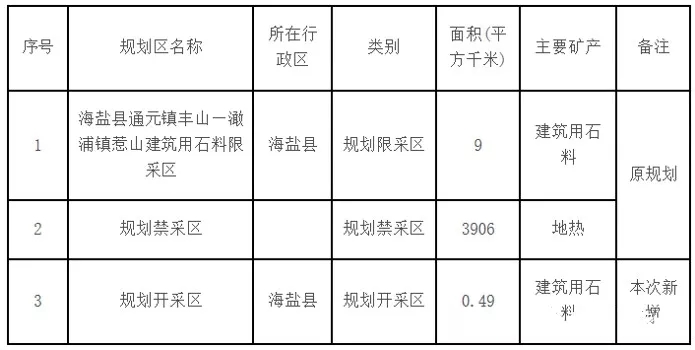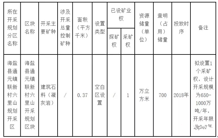 一、新增“海鹽縣通元鎮(zhèn)聯(lián)新村六里山建筑用石料規(guī)劃開采區(qū)(KC1)”