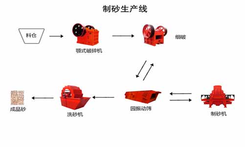 一般制砂生產線由破碎制砂設備和輔助設備共同構成,其中破碎制砂設備根據流程依次為:顎式破碎機(粗破)、圓錐式破碎機/反擊式破碎機(細破)、制砂機 ,分三個破碎等級對物料進行加工處理。輔助設備一般有:給料倉、振動給料機、傳輸皮帶機、振動篩、洗砂機。