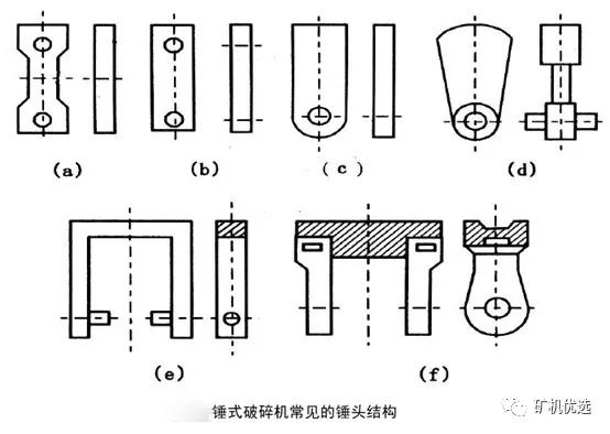 上圖中(a)、(b)、(c)是輕型錘頭,質(zhì)量通常為3.5~15.0kg,多用于破碎塊度為100~200mm的軟質(zhì)和中硬物料。其中(a)、(b)兩種是兩端帶孔的,磨損后可以調(diào)換4次;而(c)種錘頭只能換2次。(d)為中型錘頭,質(zhì)量為30~60kg,且距懸掛較遠,多用于破碎800~1000mm的中硬物料;而(e)、(f)是重型錘頭,其質(zhì)量為50~120kg,主要用來破碎大塊且堅硬的物料。