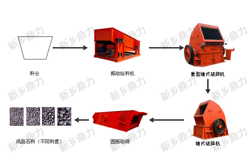 石子生產(chǎn)線主要分為給料、破碎、篩分三個環(huán)節(jié),其主要設(shè)備有振動給料機(jī)、破碎機(jī)、整形機(jī)及振動篩。大塊石頭從料倉進(jìn)入給料機(jī)之后,物料再由振動給料機(jī)均勻的喂入破碎機(jī)之后進(jìn)行破碎,破碎之后的物料通過皮帶輸送機(jī)進(jìn)入整形機(jī)內(nèi)進(jìn)行整形,后進(jìn)行篩分,直到篩出符合要求的成品料即可,不符合要求的需要再次進(jìn)入破碎機(jī)重新破碎。詳細(xì)的流程和設(shè)備可以參考下圖: