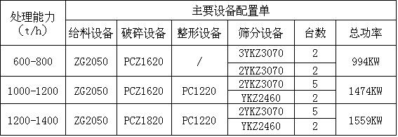 石子生產(chǎn)線由于產(chǎn)量規(guī)模不同,配置的設(shè)備也不同,新鄉(xiāng)鼎力為新老客戶配置生產(chǎn)線,從時產(chǎn)50噸-1600噸之間的生產(chǎn)線都可以進(jìn)行配置,簡單的介紹下時產(chǎn)1200-1400噸、時產(chǎn)1000-1200噸、時產(chǎn)600-800噸大型石子生產(chǎn)線配置的設(shè)備,如下圖: