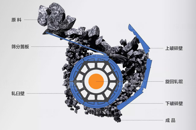 工作原理詳解:從上圖中看到,臥式旋回粗碎破碎機(jī)內(nèi)部主要由篩分篦板、上破碎壁、下破碎壁、偏心軸、旋回軋輥、軋臼壁部分組成,原料經(jīng)振動(dòng)給料機(jī)輸送至機(jī)腔內(nèi)部之前,經(jīng)過篩分篦板,會(huì)提前篩分出較小粒級(jí)的石料,直接從機(jī)器后方落下。其余物料進(jìn)入破碎腔,旋回軋輥在偏心軸的帶動(dòng)下高速旋轉(zhuǎn),并來回?cái)[動(dòng),當(dāng)軋輥靠近破碎壁,與之間隙變小,經(jīng)過多次擠壓、沖擊物料完成破碎,當(dāng)軋輥離開該區(qū)段時(shí),軋輥和破碎比之間的間隙變大,被擠壓過的物料順著間隙流出機(jī)腔。